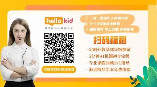 我给大家向Hellokid的老师要了免费的试听课,放在下面了!扫码就能领取,填完信息后就会有课程老师联系选外教上课!免费的,大家可以试试,让孩子来做选择!