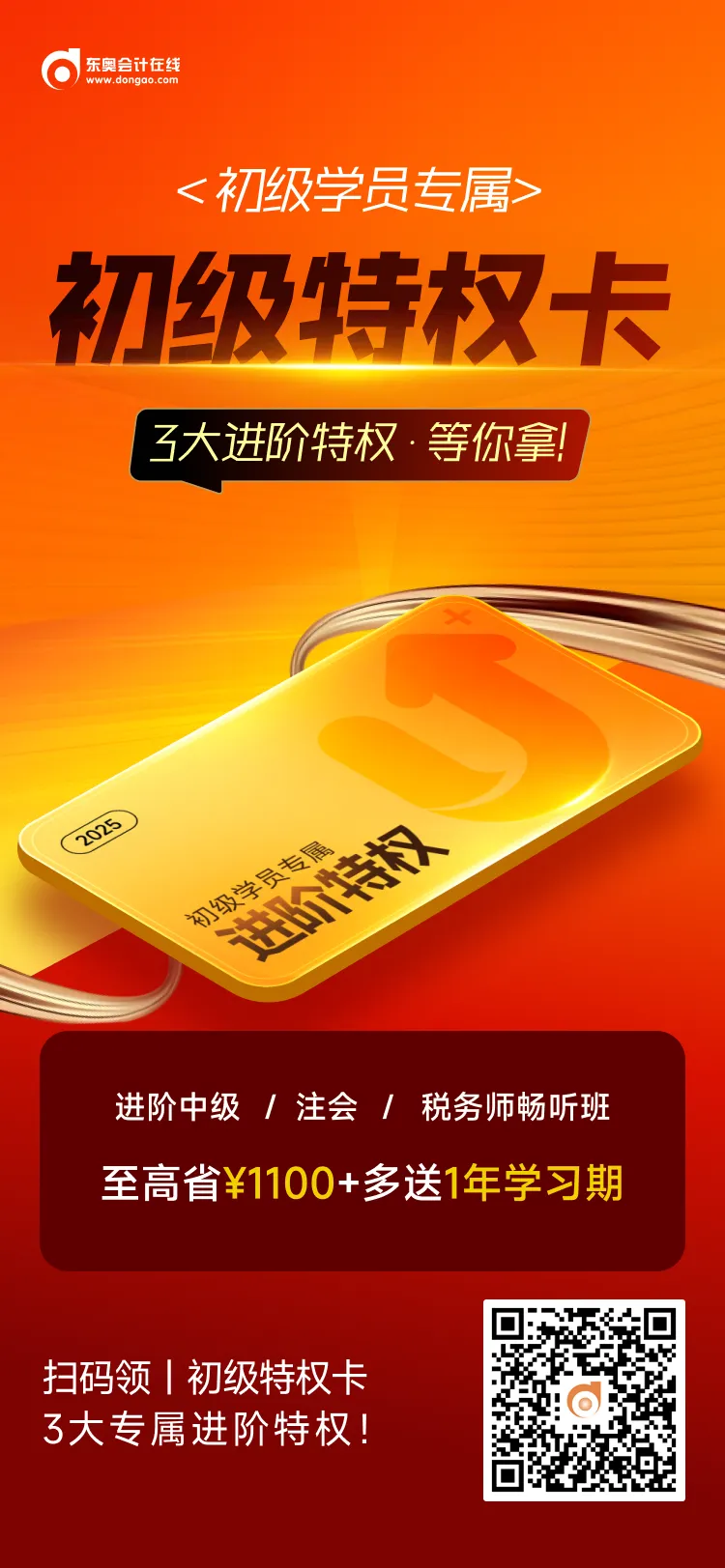 考完初级,继续拿下中级、注会、税务师现在正是最佳时机!为了小伙伴们顺利转战,📢东奥送你一张「初级特权卡」!