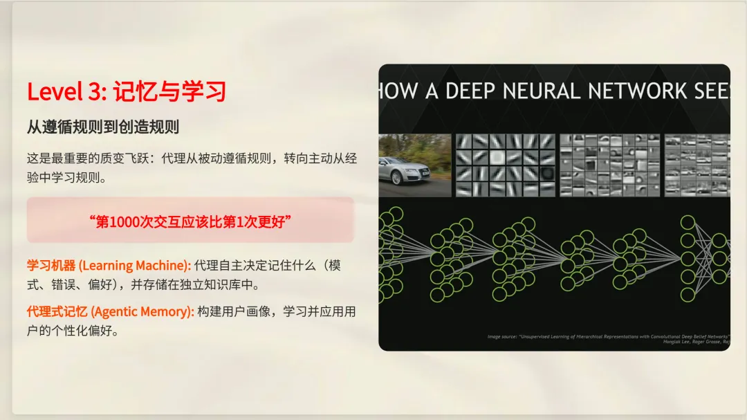 从第 2 级到第 3 级的跨越是最重要的。在第 2 级,代理遵循你给它的规则;在第 3 级,它会从经验中学习规则。
