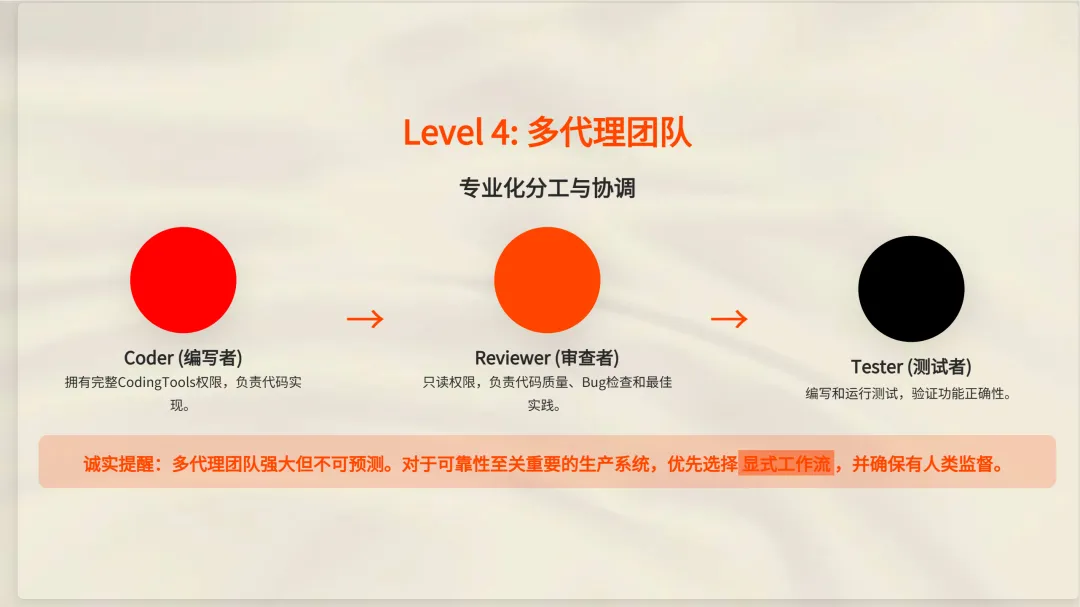 何时使用第 4 级:当你需要多种视角(代码审查就是完美例子)、任务自然分解为专业角色,或构建可让人类监督的交互工具时。