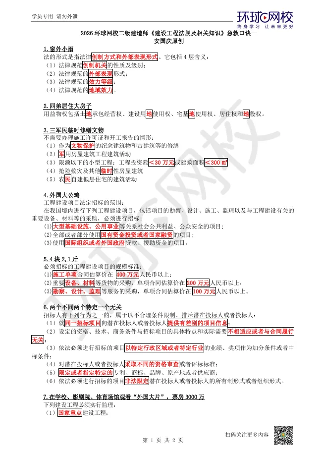 来!《2026 二建冲刺急救口诀》 专门为你这种“工作忙、记不住”的实战派准备。