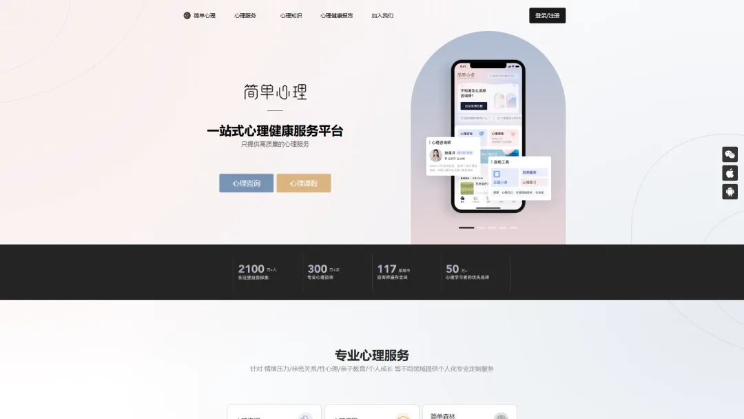 简单心理,一站式心理健康服务平台,只提供高质量的心理服务。简单心理提供在线心理咨询、心理咨询热线、面对面咨询、视频咨询、心理测试、心理学知识、简单心理uni、心理咨询师培训、心理咨询师课程、心理咨询基础课程等,是专业的心理学交流服务平台;找心理咨询、查询心理学知识、心理测试就来简单心理!