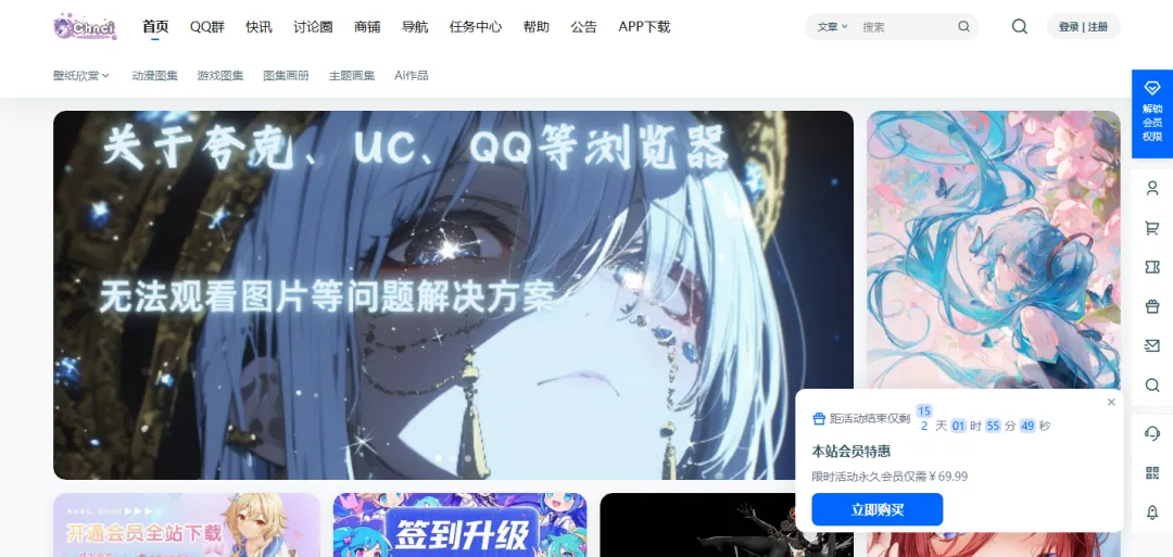 Chnci壁纸网专注做二次元壁纸,动漫、游戏、插画风格都有,画面清晰,质量在线。很多都是当下热门作品的人气角色,也能看到一些小众但惊艳的插画作品。分类清楚,更新也挺及时,想找某种风格时不用翻半天。