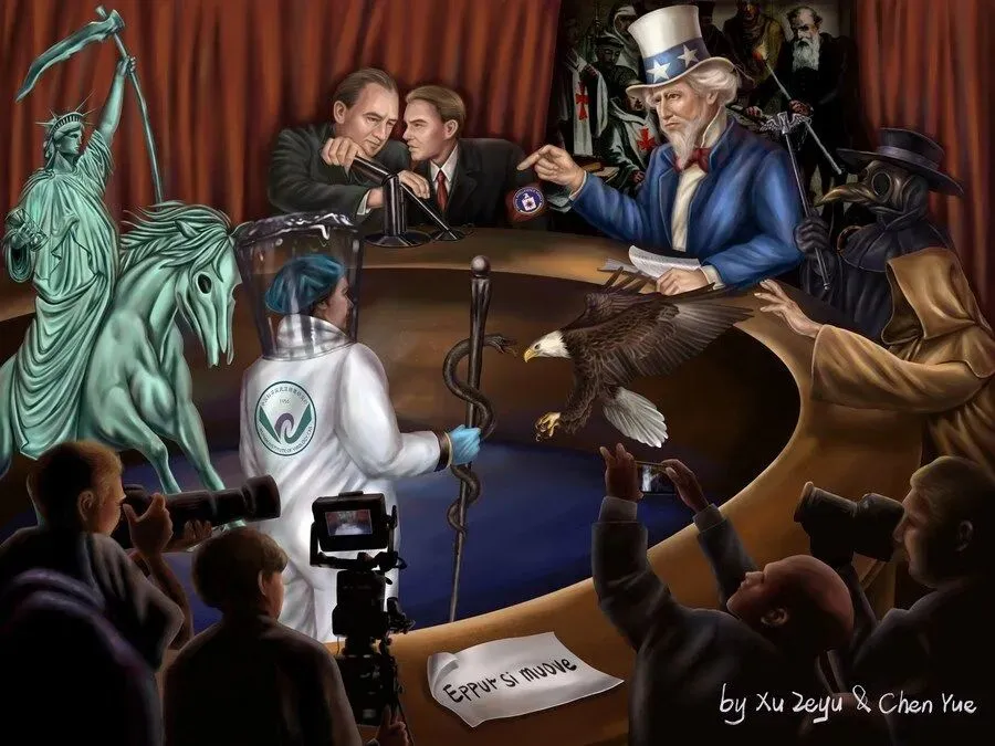漫画以美国国会听证会为场景,右上方一幅名为“被审判的伽利略”的油画以及画面下方伽利略的一句拉丁文名言“Eppur si muove”(意为“地球仍然在转啊”),都点明了这幅漫画的主题——美国政府对科学精神的打压,正如欧洲宗教裁判所对伽利略的审判一样荒谬可笑。正在受审的是一名象征着科学精神的武汉病毒研究所的科研人员。审判席上从左到右,分别坐着历史上反科学、反理性的臭名昭著的人物形象。画面左边竖立的是自由女神像与天启死亡骑士的混合体,右边则是象征美国政府的白头海雕,正扑向受审者手中的蛇形手杖。