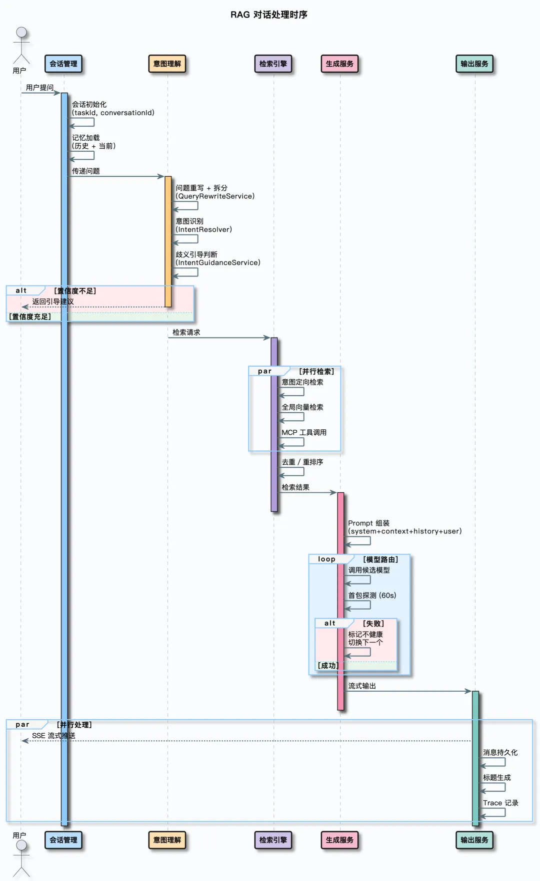 它不是调几个API 拼出来的玩具,而是覆盖了:多路检索引擎、意图识别与引导、问题重写与拆分、会话记忆管理、模型路由与容错、MCP 工具集成、,文档入库流水线,全链路Trace等全链路能力。一句话:企业里做RAG会遇到的问题,Ragent都给出了对应方案。