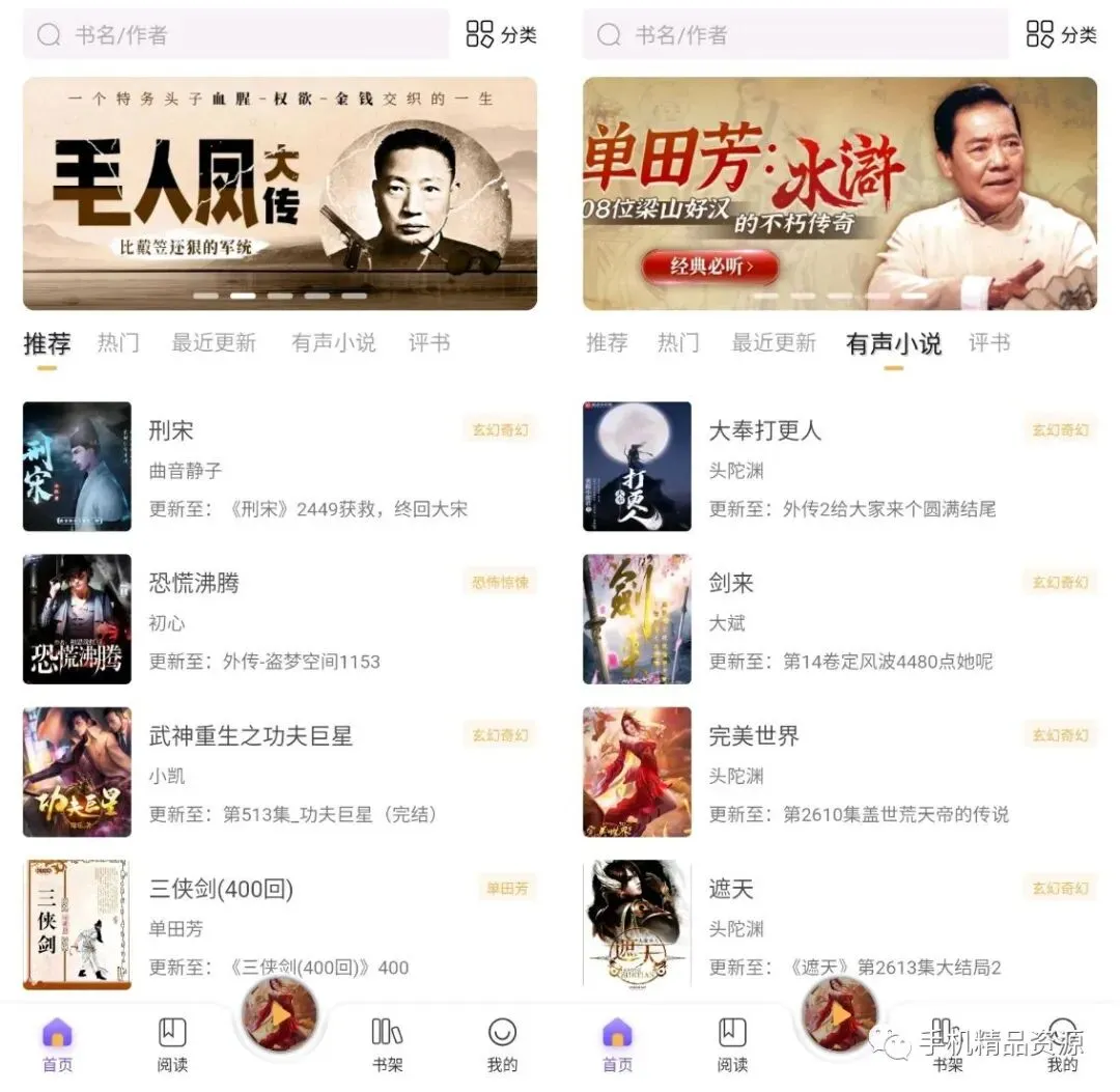 飞韵听书的有声资源共分为三大类:评书、综合、有声小说;首页还有最近更新、推荐、热门专区,自带书城,书籍题材分类详细,找书方便。