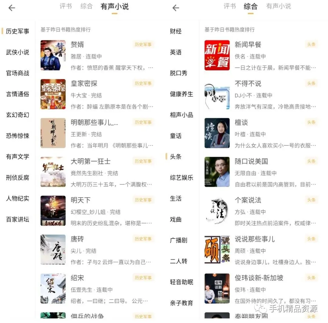 综合分类下就更多了,头条、健康养生、教育培训、财经、英语、相声小品、综艺娱乐、亲子教育、轻音助眠、脱口秀、二人转、广播剧、戏曲、童话。