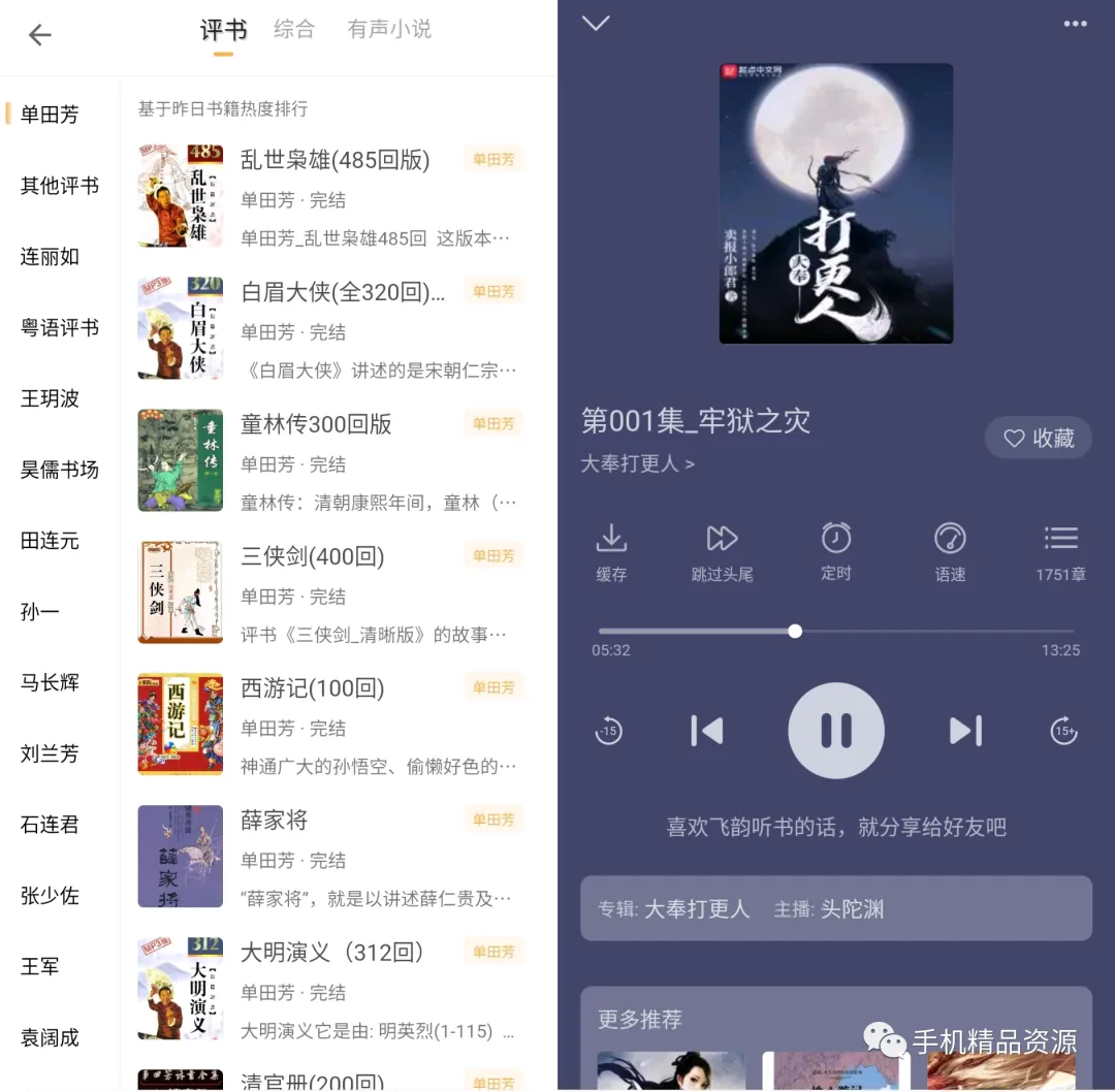 听评书也是本软件的重要功能,集合了多为评书名家的作品,例如:单田芳、袁阔成、连丽如、王玥波、田连元、刘兰芳、张少佐、马长辉等十多位评书大家。