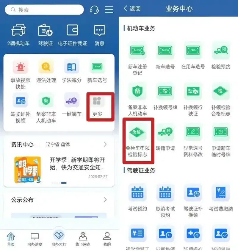 2.首页点击更多→在 “机动车业务” 中选择免检车申领检验标志。 -