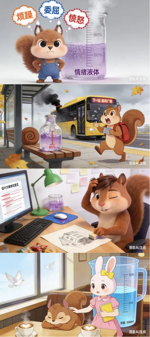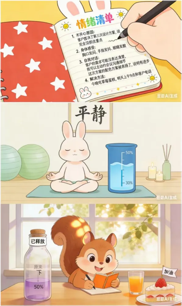 漫画里的小松鼠曾是“暴躁小炮仗”——赶不上公交会炸毛,工作出错会崩溃,总会因为一点小事情而陷入情绪内耗。直到它发现,闺蜜每次遇到烦心事,都会先花5分钟写“情绪清单”:写下不开心的原因、当下的感受,再做3次深呼吸。小松鼠跟着尝试:把“被客户否定”的委屈写下来,发现愤怒背后是“怕做不好”的焦虑;给“和朋友拌嘴”的失落贴个“只是误会”的标签,情绪慢慢就平复了。