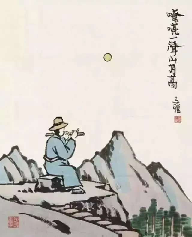 作者把自己在夜宿寺庙时的孤独心态刻画的活灵活现。画面中,一老者身着长衫坐在山头,嘹亮优雅的笛声在清冷月光的陪伴下,引发群山共鸣。惟美的画面激起观赏者的无限遐思:是辛勤劳作后的放松、还是情不如意时的喧泄?是欢乐的表白、还是忧伤的流露?