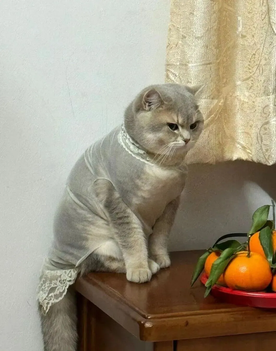 有个主人是真扛不住了 , 直接上手给猫做了件”防掉毛神器” , 听着挺靠谱对吧 , 结果成品一出来 , 好家伙 , 蕾丝纱衣一件~