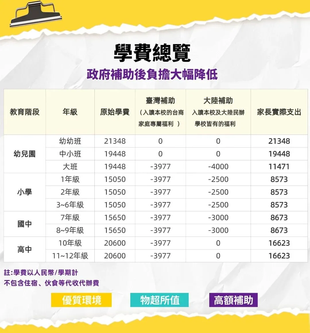 ● 性價比高的優質教育:在享有兩岸部門提供的雙重學費補助後,台校的學費相較於珠三角地區同等級的民辦學校,具有顯著的價格優勢。家長能以更合理的投入,讓孩子享受到與國際水準接軌的優質全人教育。