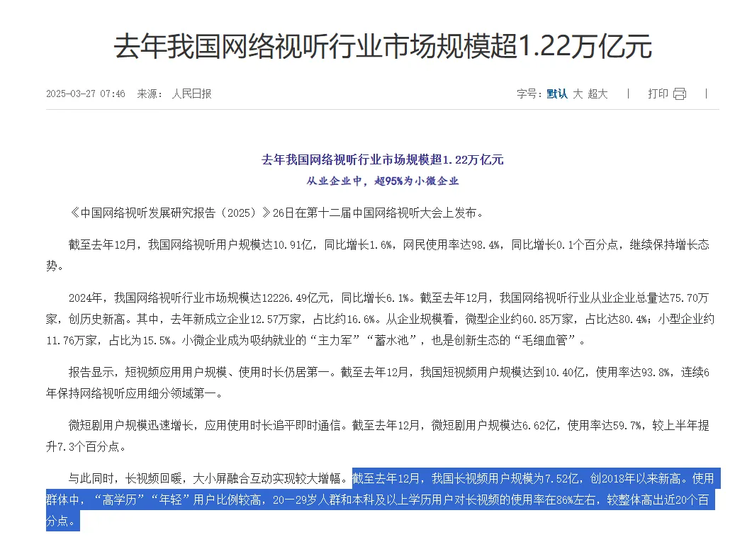 尽管在短剧战场上收效甚微,但长视频平台也并非全无胜算。数据显示,截至2024年底,我国长视频用户规模已达7.52亿,创历史新高,且呈现出“高学历”“年轻化”的特征。这证明愿意为优质内容付费的核心用户基本盘依然坚实。