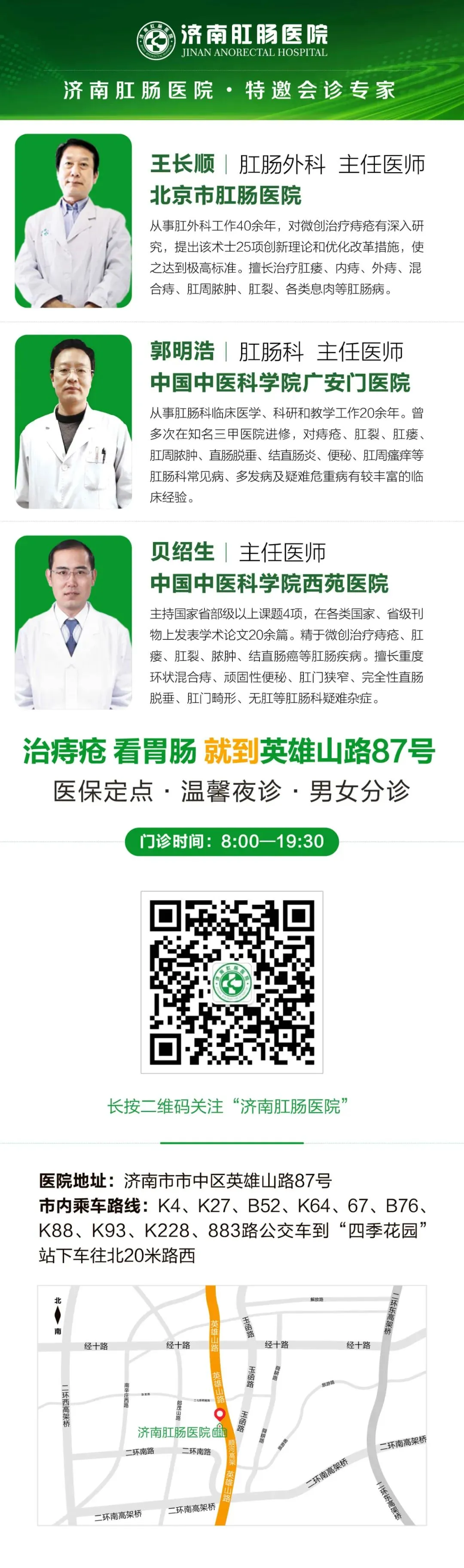 济南肛肠医院坐落于英雄山路87号,是一所集医疗、预防、保健及学术交流于一体的现代化大型专科医保定点机构。自2007年启航以来,始终恪守“以专家为核心、以技术为依托、以服务为宗旨” 的发展理念,创新构建精细化诊疗体系——痔疮病专科、肛周病专科、肠道疾病专科、消化病专科及女子肛肠诊疗区,实现专病专治的精准医疗模式。无论是痔疮、肛瘘等肛肠顽疾,还是胃肠炎、胃肠息肉等消化系统常见病与疑难病症,都能获得科学高效的诊疗方案,为广大市民筑牢健康防线。