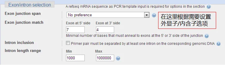 如果设计的引物是跨内含子和外显子的交界处,可在此处设置成为Primer must span an exon-exon junction。外显子的匹配碱基数和内含子的长度等设置一般选择默认。