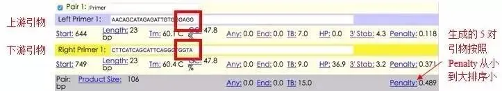 ,可获得若干对引物,并按照5’到3’的顺序,包含了引物和产物的一些基本参数。可以根据荧光定量引物要求,尽量选择G、C结尾的引物合成,如下图中红框所示,还可以在序列图中看到引物的位置。