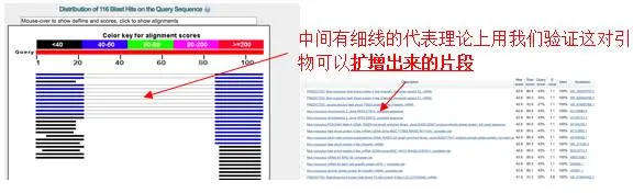 9、点击BLAST,开始比对,出现结果。颜色代表得分,选择引物的原则是:列表中大部分是目的基因,说明引物特异性高;但是可能物种不同,说明该基因在不同物种中保守。