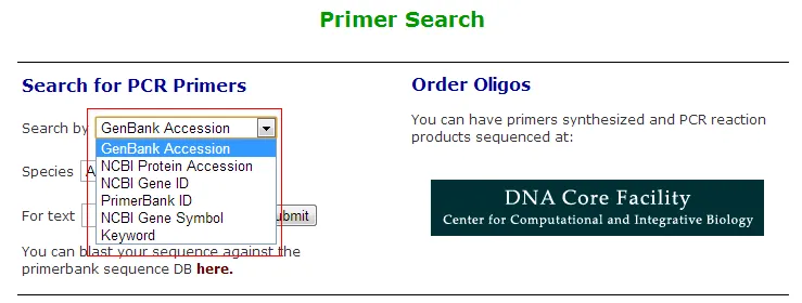 搜索类型这里,可以根据GenBank accession、NCBI protein accession、NCBI gene ID、primerbank ID、NCBI gene symbol以及keyword六个选项进行搜索。以小鼠的beta-actin为例。