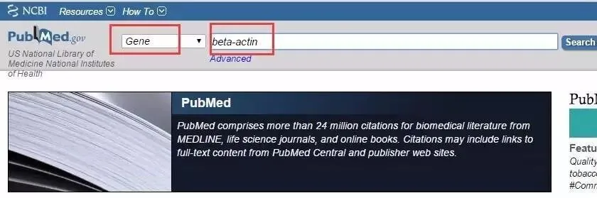 1、首先,到NCBI上找出β-actin的gene ID,如图,选择gene,输入beta-actin: