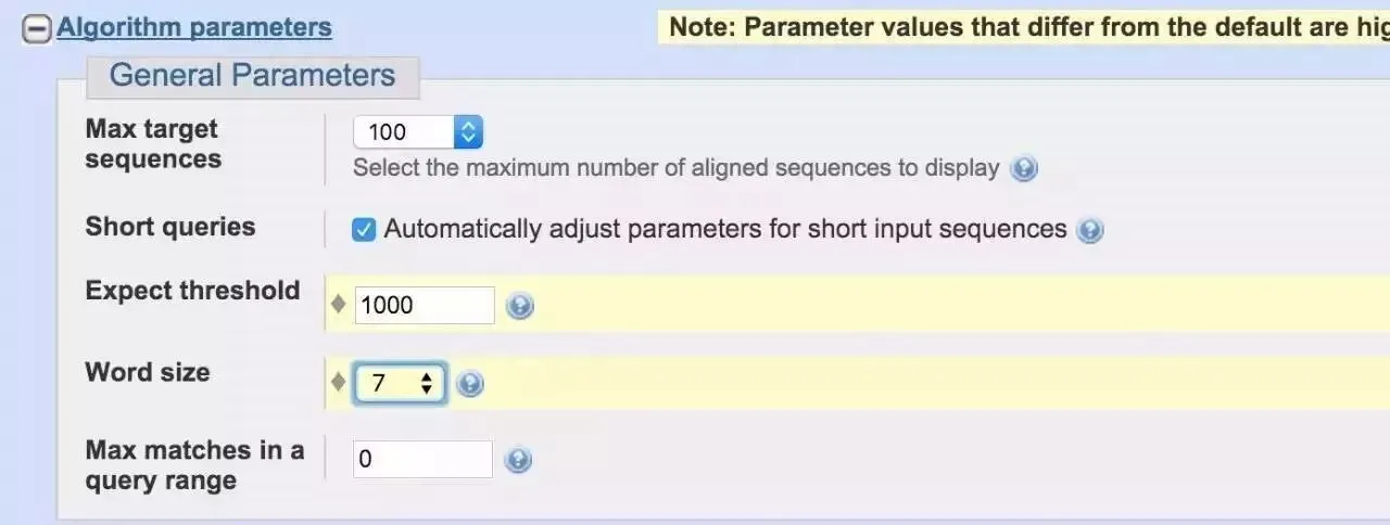 8、点击Algorithm parameters, 在Expect threshold 输入1000,在Word Size 输入7。Word size不是字体大小的意思,应该理解为读长,按照7个一组核苷酸序列放到GeneBank中进行比对。