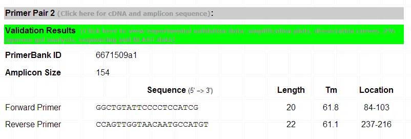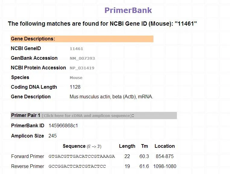 3、若是改输入beta-actin的NCBI gene symbol:actb,也可以得到相同的结果,往下拉我们还能看到经过验证的引物:
