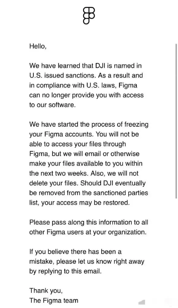 3 月 12 日,网上流传一份 Figma 发送给大疆的内部邮件。其中写道:“我们了解到,大疆在美国制裁名单中被点名。因此根据美国法律,Figma 无法再为您提供对我们软件的访问权限,我们已经开始冻结您的 Figma 账户。我们将在未来两周内通过电子邮件或其他方式将您的文件提供给您。此外,我们不会删除您的文件。如果大疆最终从受制裁方列表中删除,您的访问权限可能会恢复。”