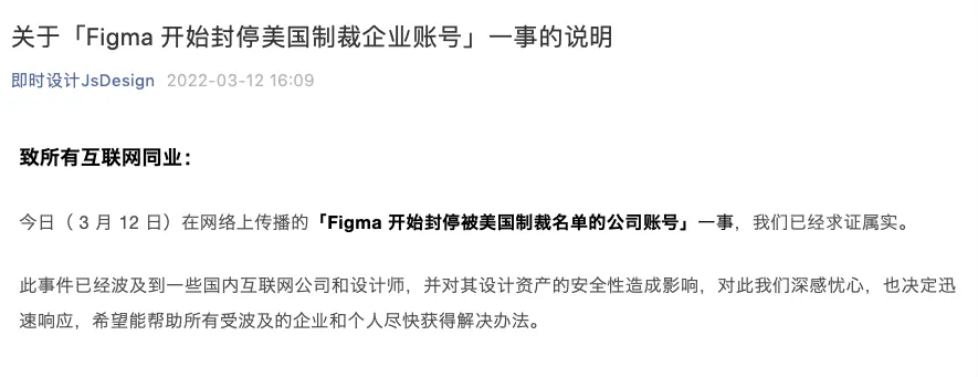 即时设计 JsDesign 也发布公告称,3 月 12 日在网络上传播的“Figma 封停所有被美国制裁名单的公司账号”一事,公司已经求证属实。据官方资料披露,“即时设计”是 2020 年 9 月发布的国内首款专业 UI 设计工具,并于同年 11 月正式开放注册。