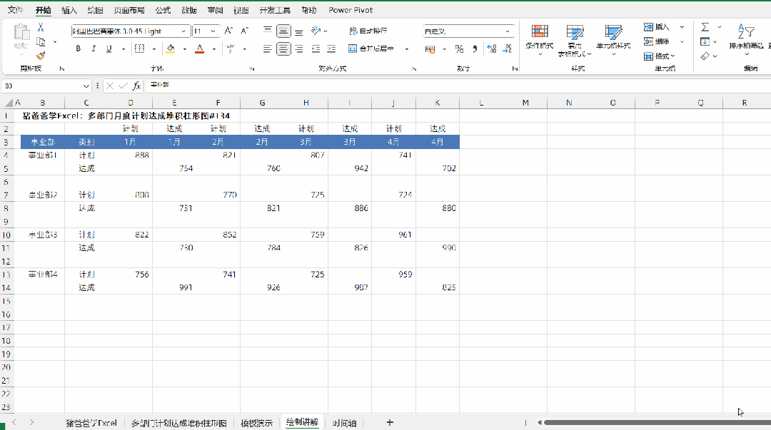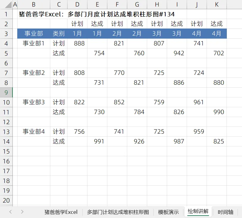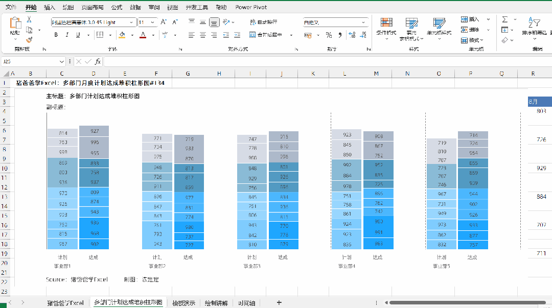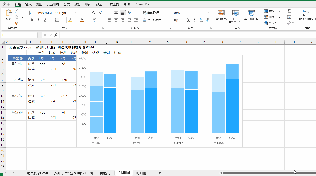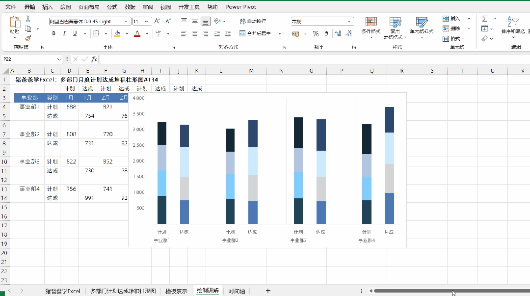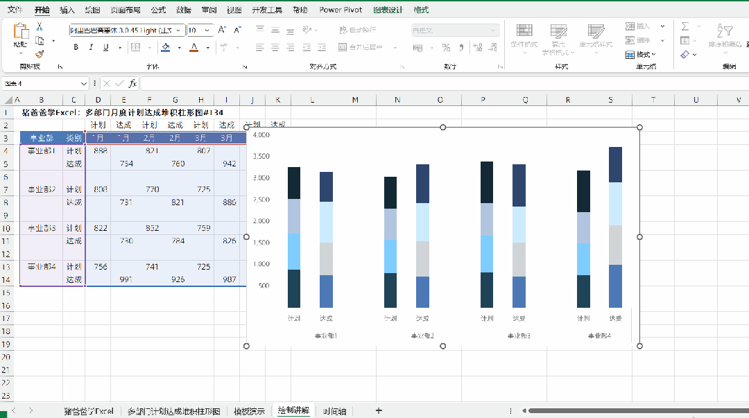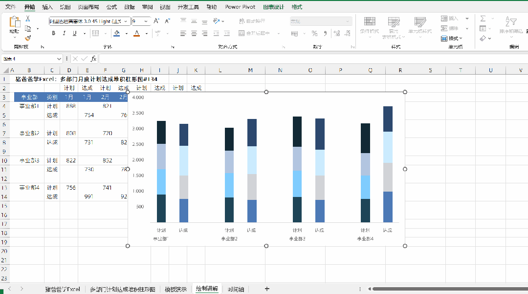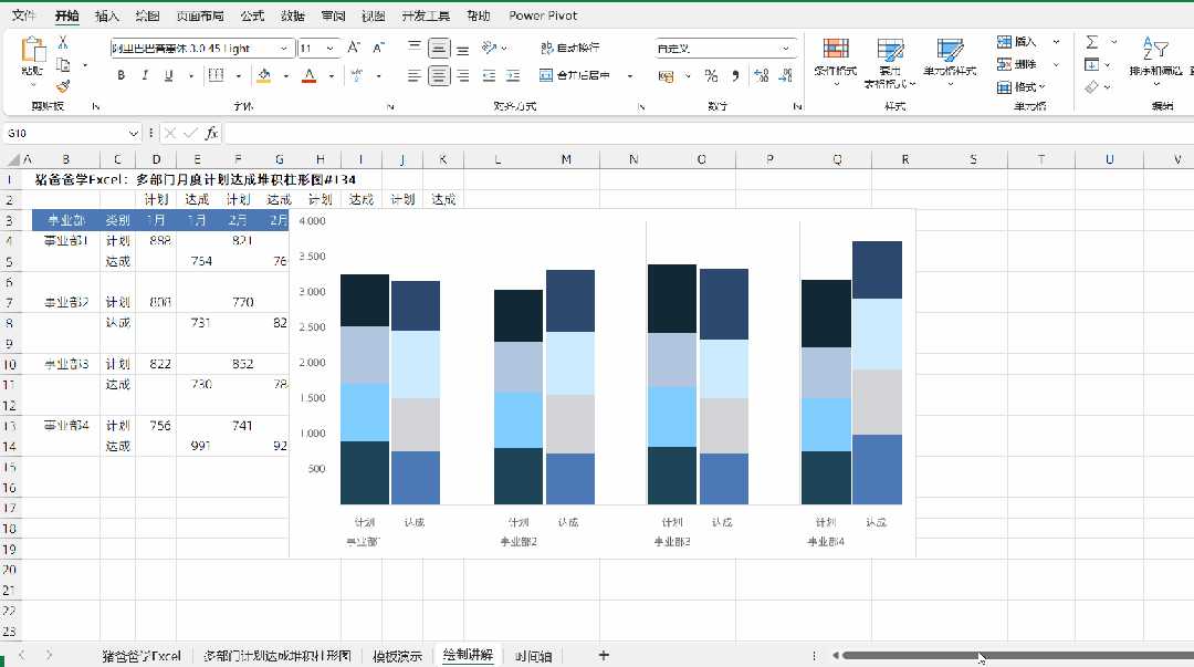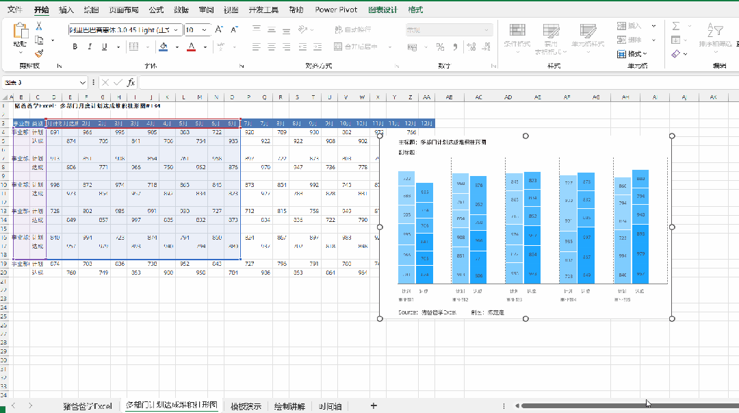 这一节是猪爸爸学excel图表之多部门月度计划达成堆积柱形图