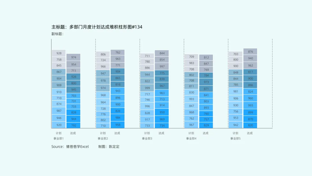 多部门月度计划达成堆积柱形图|猪爸爸学Excel图表