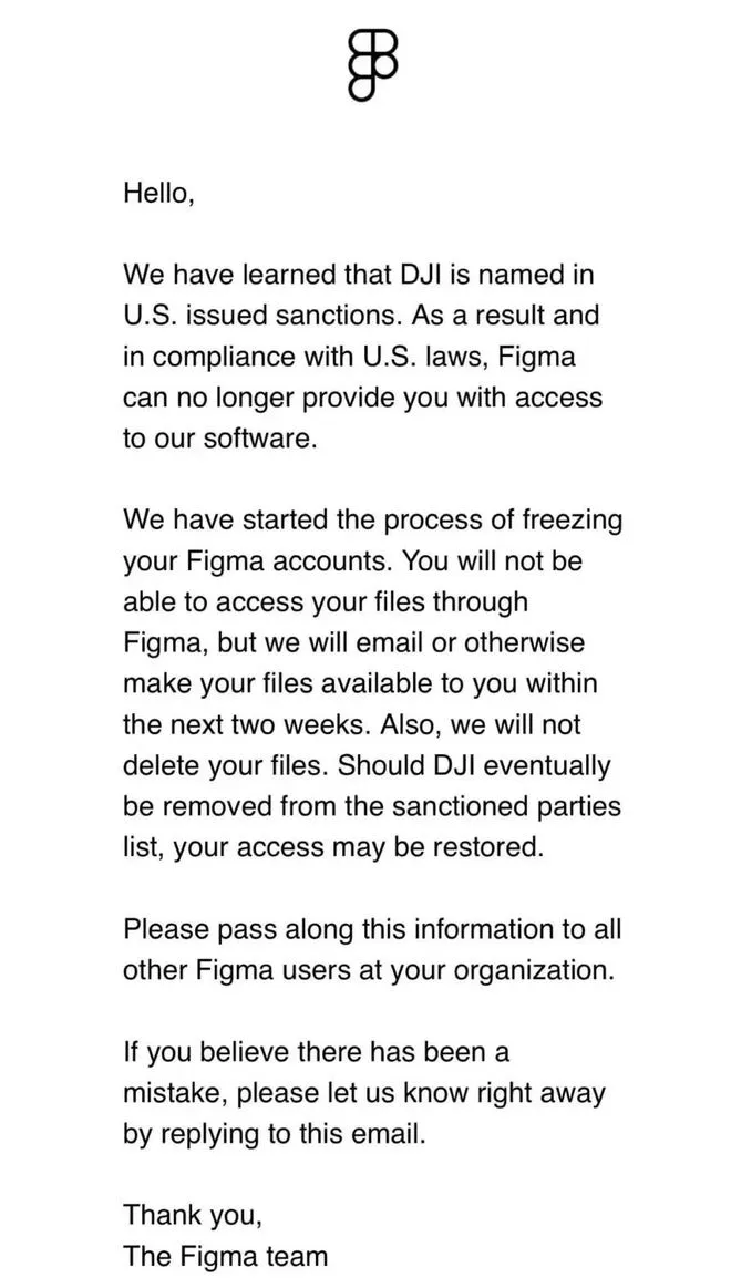 3月12日据多家大型媒体报道,UI设计协作工具软件Figma已经封禁中国大疆,并封停所有被美国制裁名单的公司账号,也就是大疆和这些公司都不能再使用Figma公司的软件,此消息已经被大疆公司确认。
