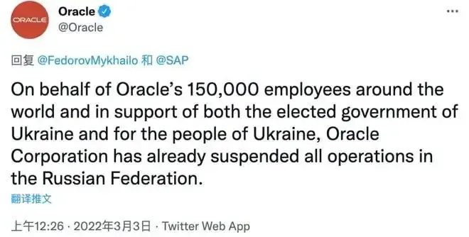 Oracle停止俄罗斯业务的声明(来源:Oracle的Twtter帐号截图)