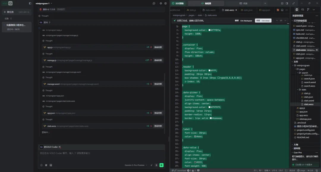 我在 Spec 模式里选用的模型是 Gemini 2.5 Pro Preview,把需求提示词丢进去,它帮我把整个小程序项目框架都搭好了。