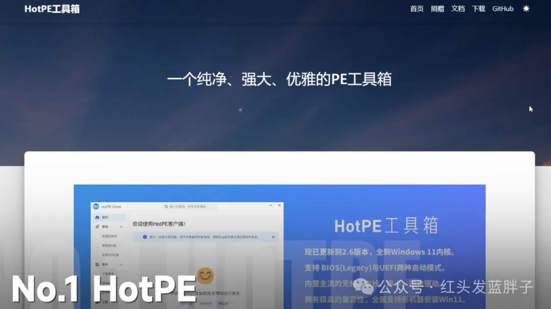 Hotpe是一个纯净、强大的开源WindowsPE采用全新的windows11内核,支持Legacy和UEFI两种启动模式,内置主流的无线网卡、有线网卡、磁盘驱动等,拥有极高的兼容性