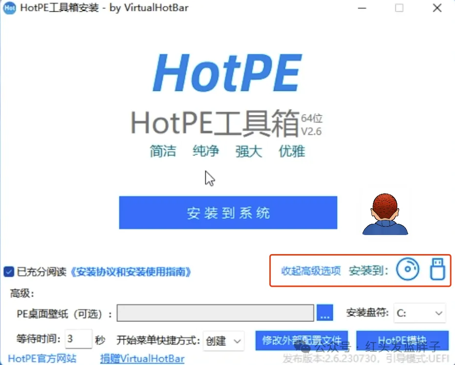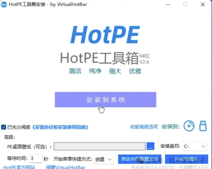 软件界面非常简单,主要 3 个按钮,分别是安装到系统,安装到光盘,安装到usb设备