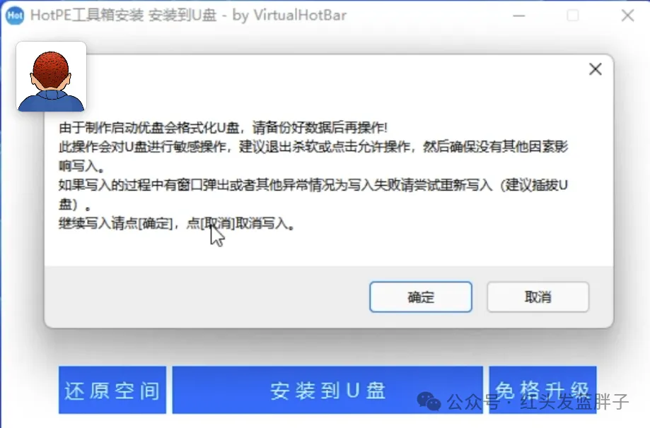 然后点击安装到u盘,制作 u盘启动盘会重新格式化你的u盘,一定要做好数据备份在操作。点击确定后,开始制作hotpe 的u盘启动盘。