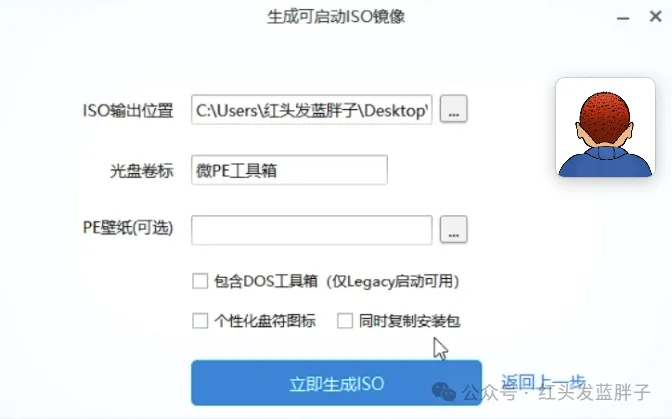 选择输出文件的位置,点击立即生成ISO即可自动生成pe的iso镜像文件