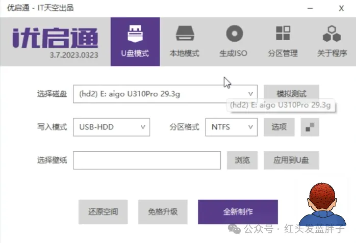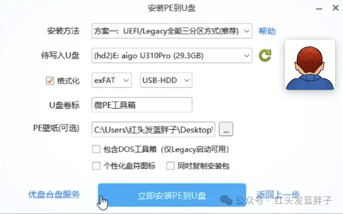 选择安装的u盘,我这里是爱国者 32G 的 U 盘。文件系统,选择 exFAT,安装方法选择推荐的即可,卷标就是u 盘的名称,可以自定义。然后可选一张喜欢的图片作为 pe的壁纸。
