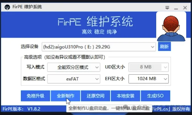 界面也很简单,主要有免格式化升级,可以升级原有firpe版本。全新制作,还原空间,本地安装和生成iso文件