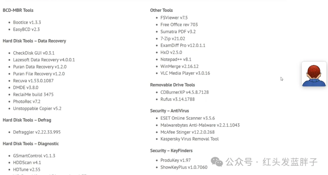 网站详细的列出了pe中包含的软件。