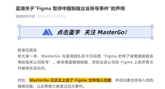 3月12日晚间,蓝湖协作平台称,蓝湖旗下MasterGo已正式上线了Figma文件导入功能,并且完善支持导入后的编辑功能,以此帮助大家渡过这次事件。