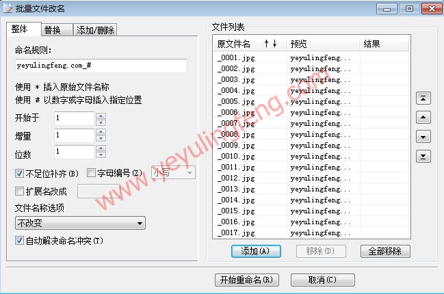 例如将123.png的图片文件设置yeyulingfeng.com_#的规则,则重命名文件名将更改为yeyulingfeng.com_1,多张图片时数字一次递增