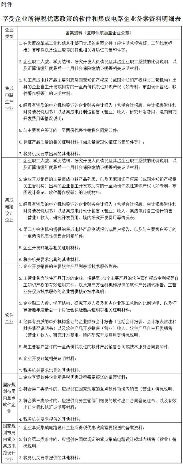 附件:享受企业所得税优惠政策的软件和集成电路企业备案资料明细表