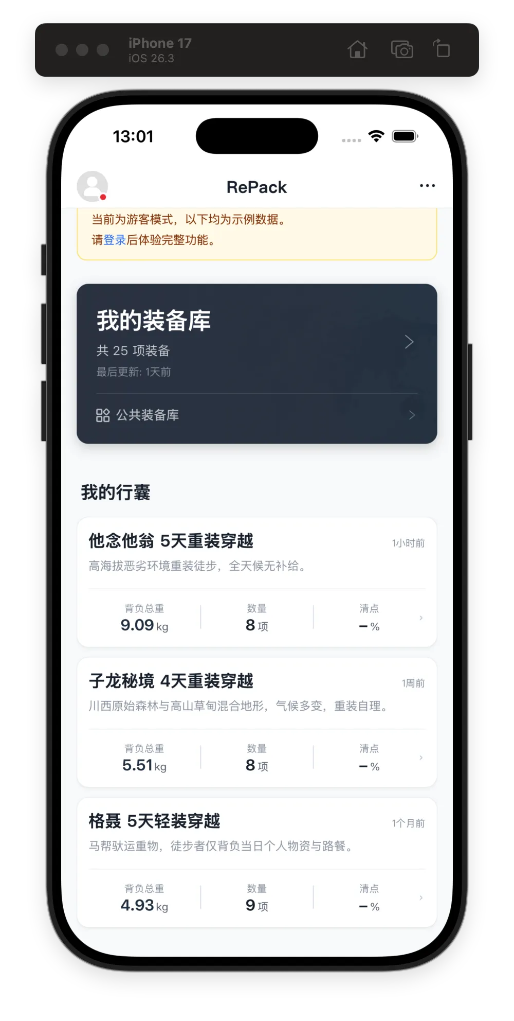现在,这不仅仅是一个能算重量的工具,已经进化为“装备入库 -> 行囊规划 -> 行前清点 -> 离线查阅” 完整的装备管理工具了。