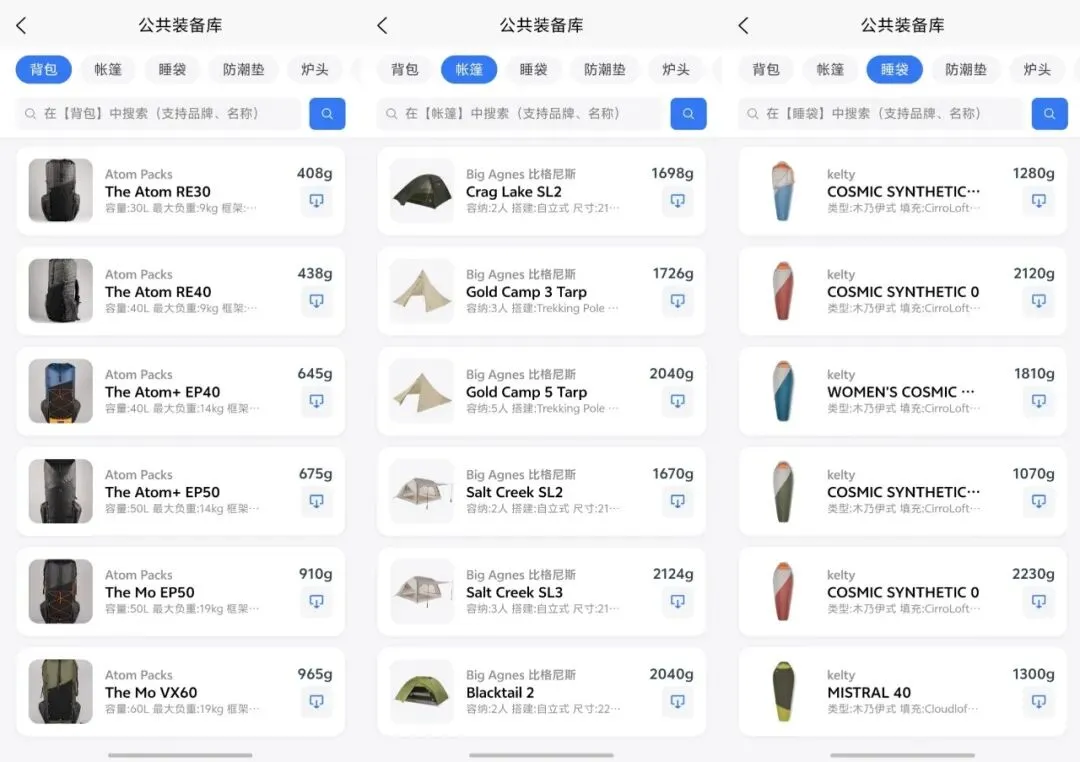 🆕公共装备库(一键打底):本次新增!目前接入了 PackWizard 的两千多条数据,涵盖了帐篷、防潮垫、背包、睡袋、保暖衣物、炉具等六大类。