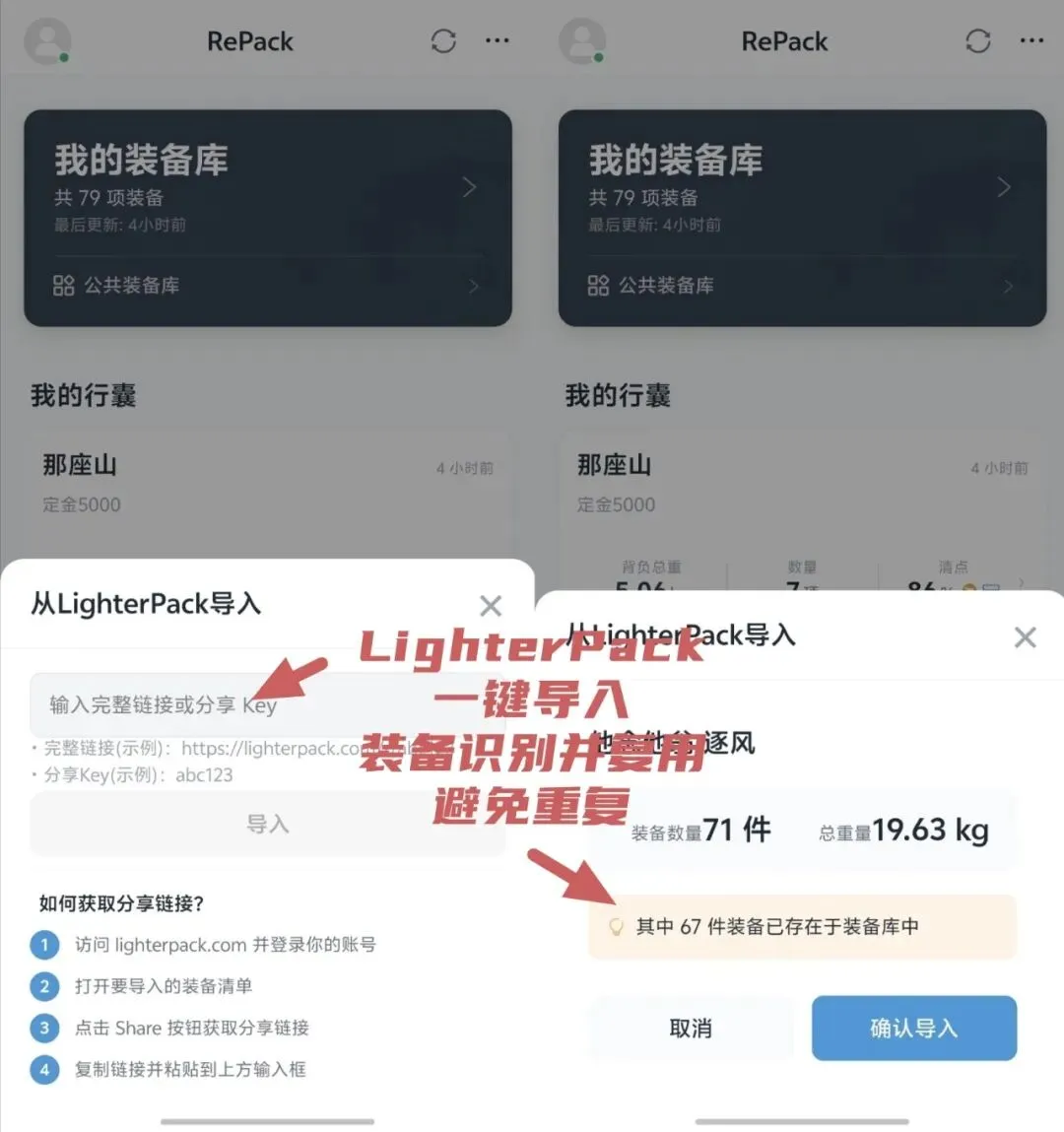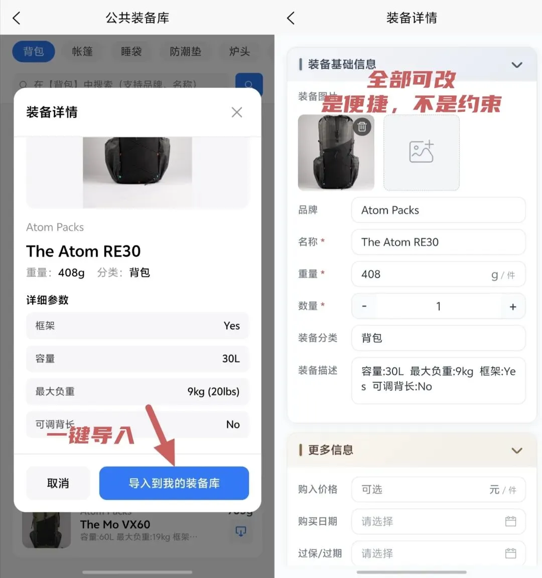 🆕 公共装备库(本次新增):接入 PackWizard 装备数据,一键导入品牌/重量等骨架信息,告别纯手工录入