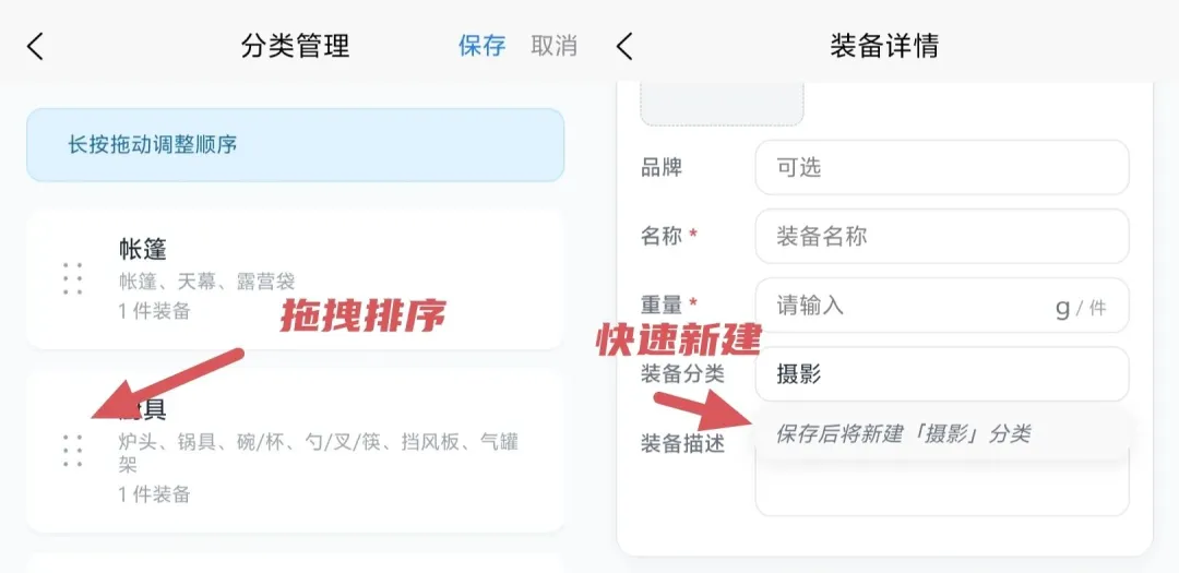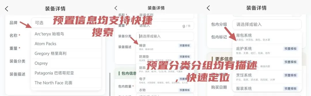 🆕 常用预置模板,优化体验:不想从零建分类?App 现已内置常见的户外装备品牌、经典的分类体系以及打包分组模板。并优化了分类与分组的管理。