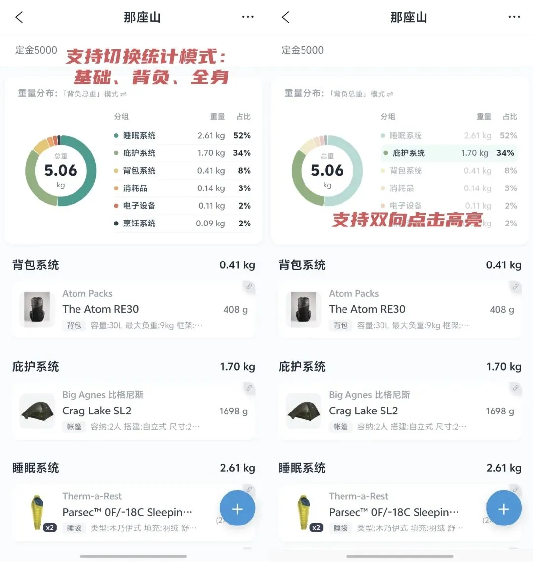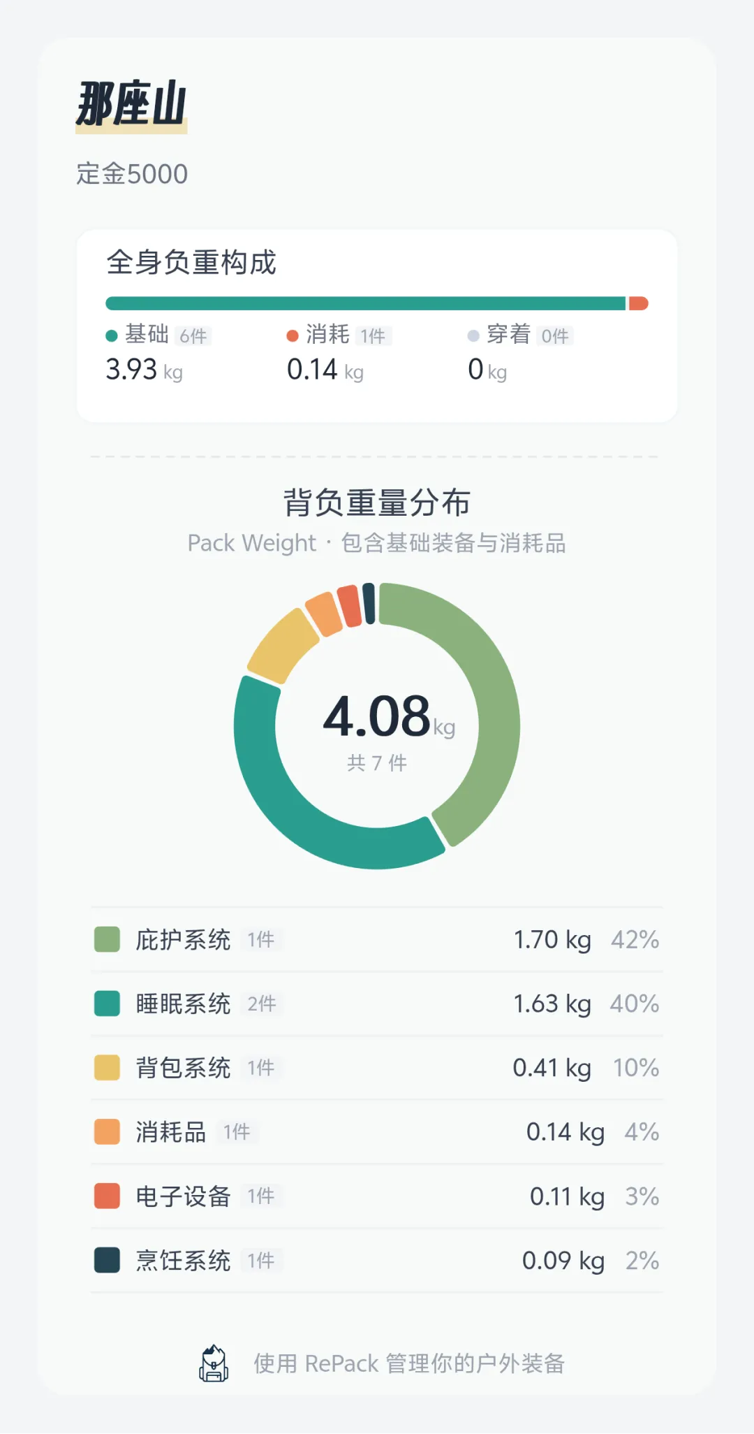 重量透视:APP 会自动将总重量精细拆分为“基础重量(Base Weight)”、“消耗品(食物/燃料等)”和“穿着在身(不计入负重)”。配合直观的分类饼图,你的轻量化空间在哪里,一目了然。