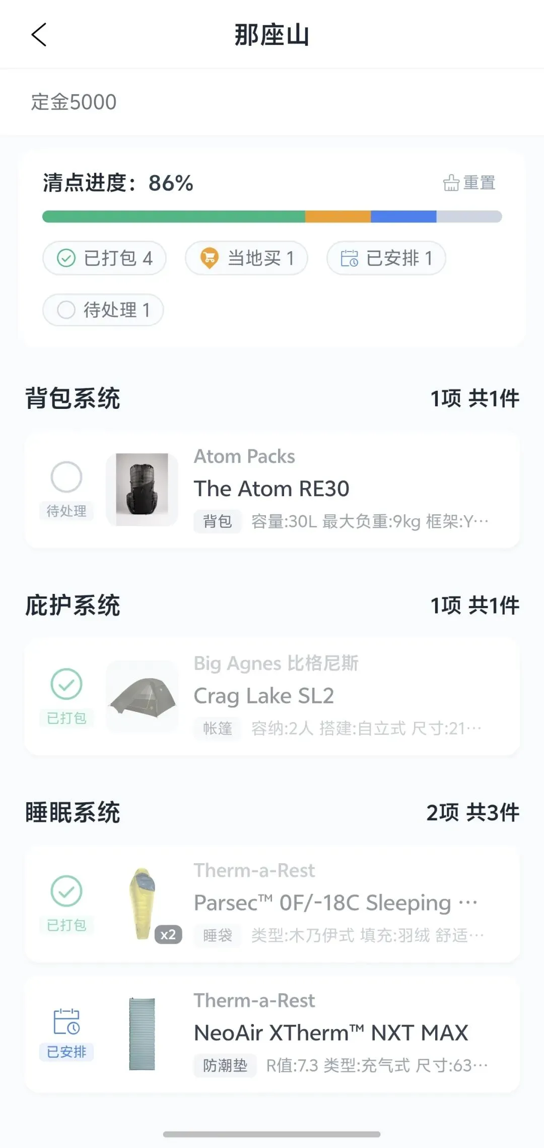 现在,App 里有一键清点模式,装备清单变成带进度条的打卡列表。