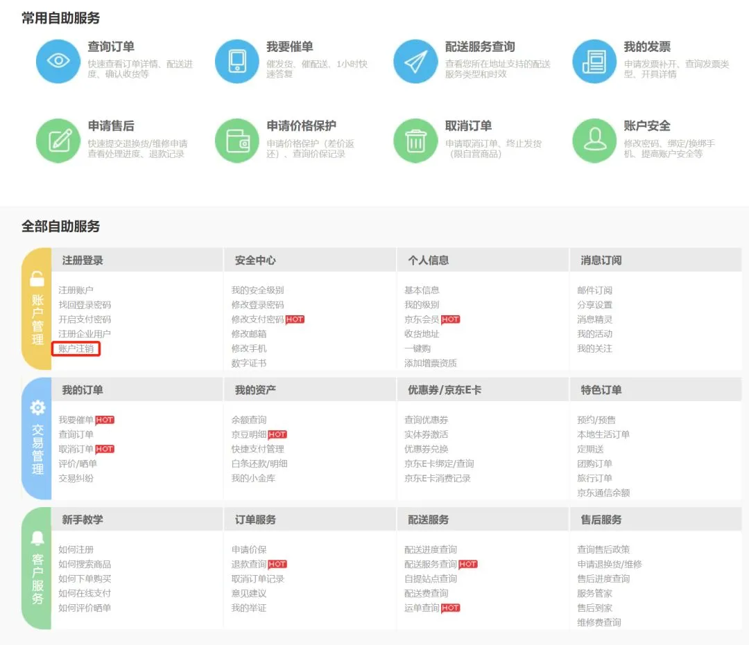 点开那个页面以后,你在下方的全部自主服务里,终于可以找到 “ 账户注销 ” 了。